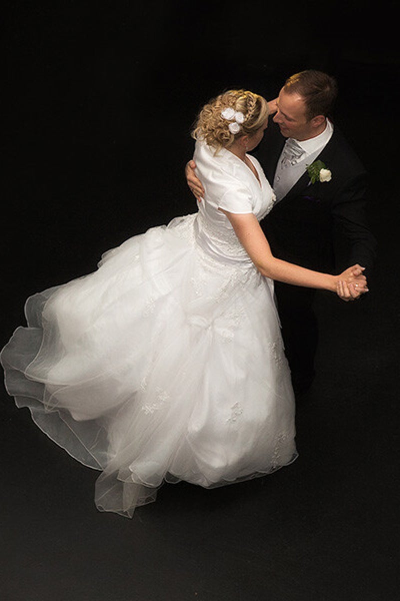 Manchmal bringt auch das Brautpaar eine originelle Idee mit. Mehrere Stunden lang wurden bei dem Bild unten für das Paarshooting auf einer Theaterbühne Lampen aufgehängt und eine Schaukel installiert. Herausgekommen sind ganz besondere Fotos mit bleibendem Wert.