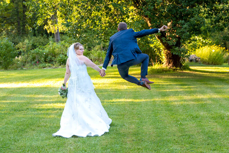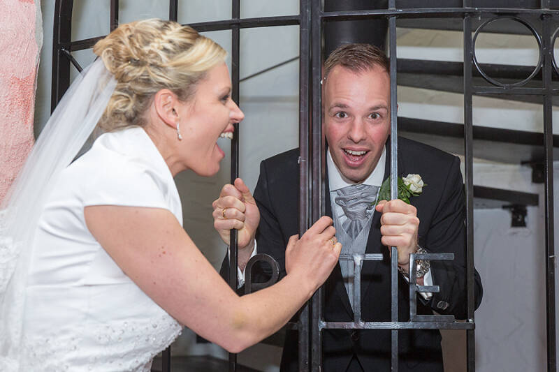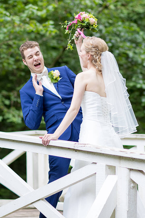 Last but not least ist man als Hochzeitsfotograf auch hinsichtlich der Kreativität gefragt. Zu jeder Hochzeit gehört ein Paarshooting, und das soll möglichst originell ausfallen. Ich habe es mir zur Gewohnheit gemacht, die Orte der Trauung und der Feier im Vorfeld zu besuchen, um die Möglichkeiten auszuloten. Es ist ebenfalls von großem Vorteil, sich ein paar Gedanken darüber zu machen, was man mit seinem Brautpaar "anstellen" möchte, damit die Fotos nicht wie 1000 mal gesehen daherkommen. Damit der Bräutigam gleich mal weiß, woher der Wind in Zukunft wehen wird, entstand das untenstehende Foto. Die Braut, das kann ich versichern, hatte auf jeden Fall ihren Spaß...