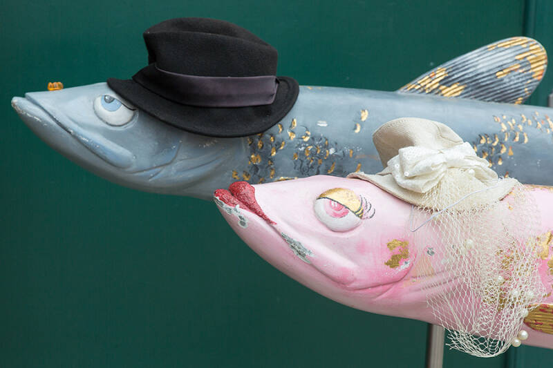 Das alles hat selbstverständlich seine Berechtigung, aber ich persönlich suche auch stets nach den besonderen Akzenten. Im Bild oben sind das beispielsweise die Form und Farbe der Location, die das Bild wirken lässt. Das Bild links lebt indessen von der Bildidee: Brautstrauß und Strumpfband der Braut achtlos auf dem Lampenschirm des Hotelzimmers drapiert, sind ganz sicher nicht das Highlight des Tages, aber dennoch ein witziges und originelles Detail, verwendbar zum Beispiel als Auflockerung in einem Fotobuch. Es schadet auch nicht, die Umgebung sorgsam zu beobachten, die Kopfbedeckungen der Fische im Bild unten wären mir ansonsten entgangen.